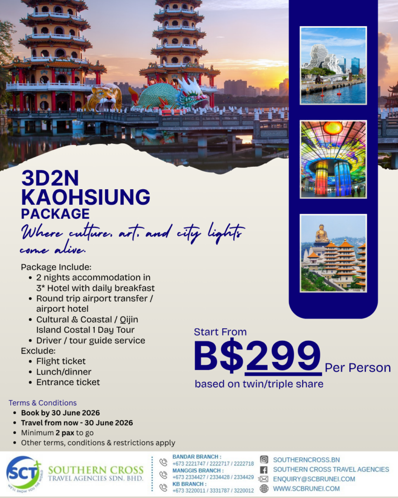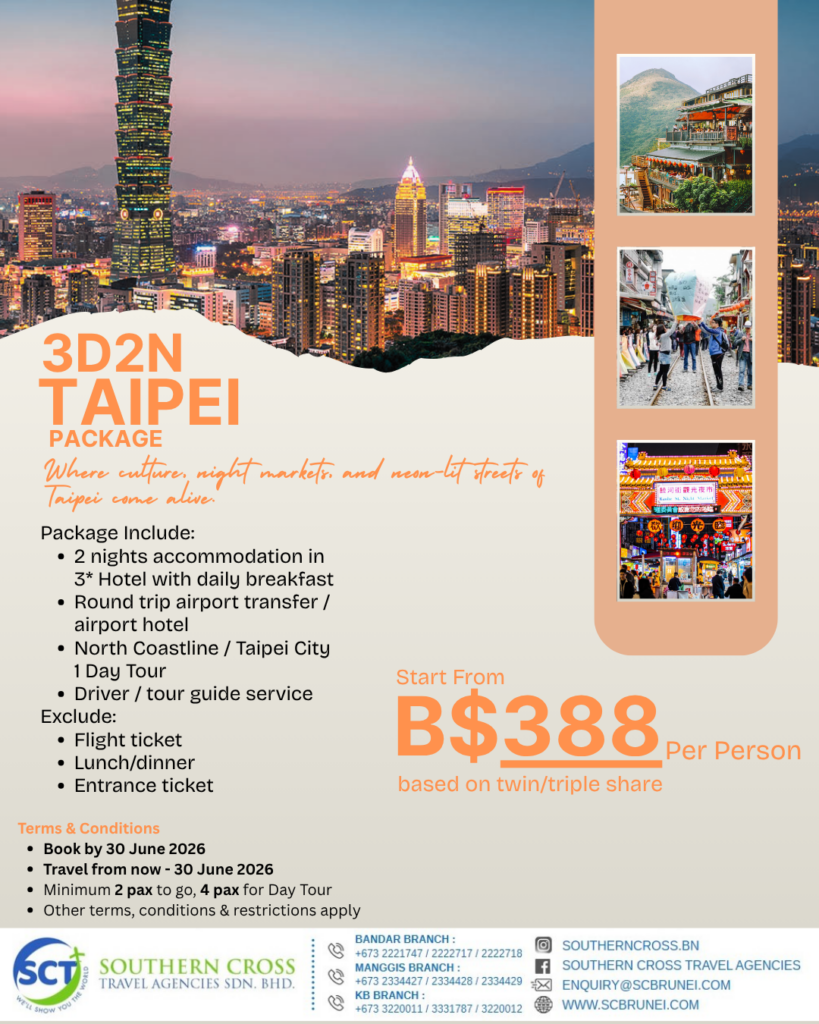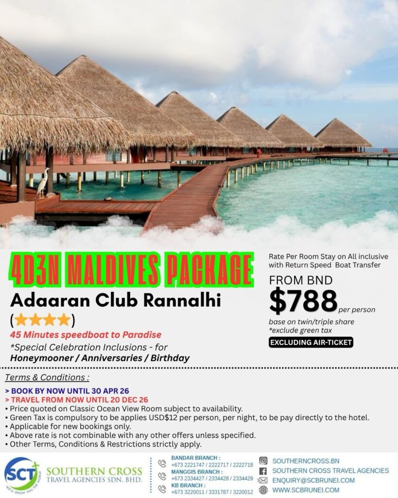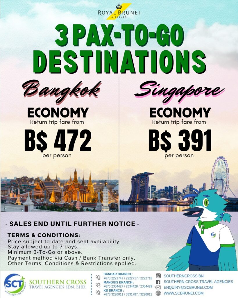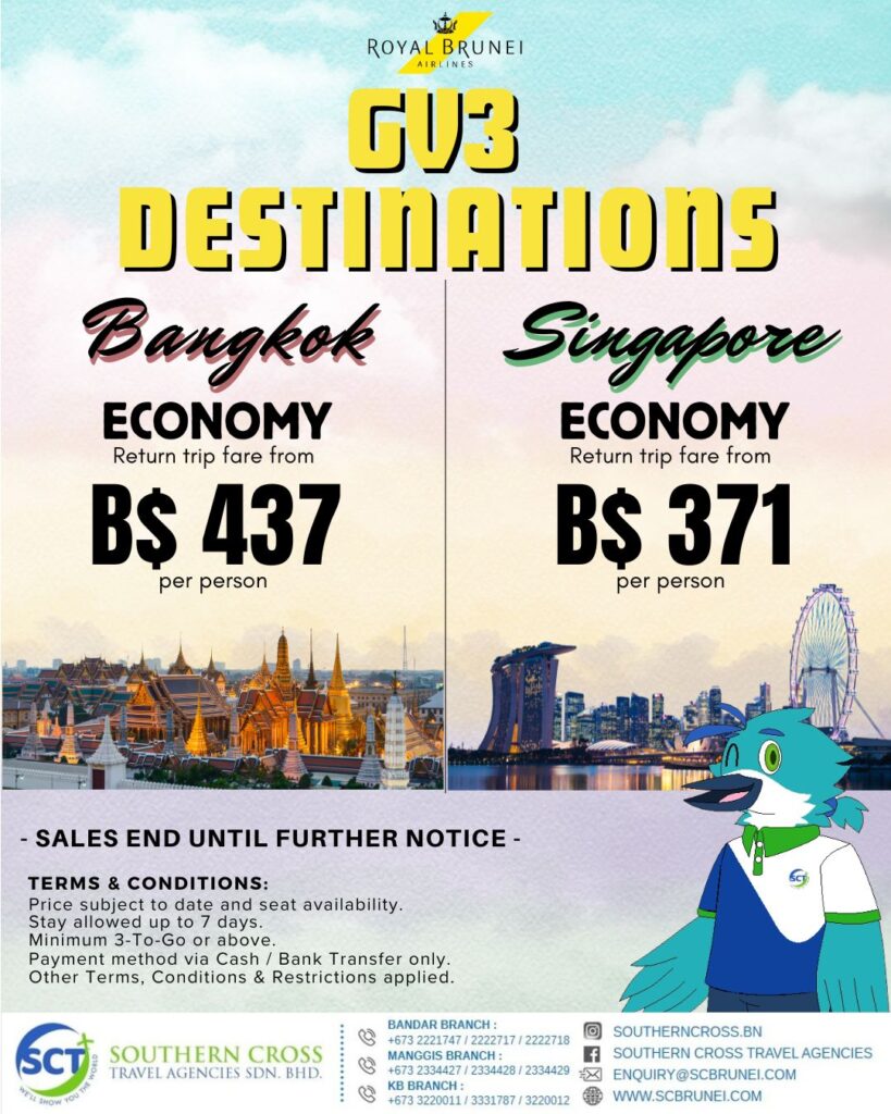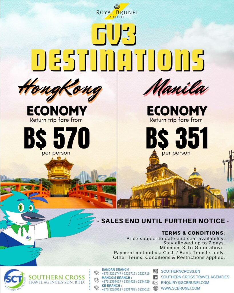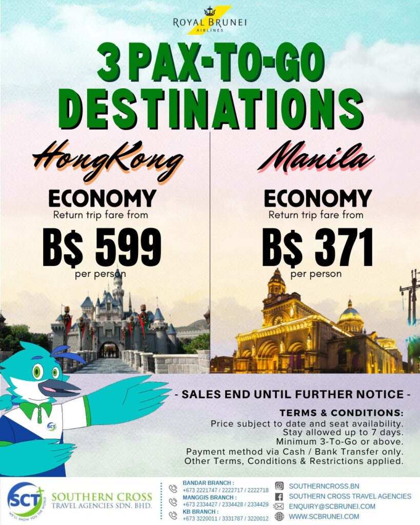 Return Economy class air-ticket on Royal Brunei Airlines, 3Nights Hotel accommodation base on twin share. Hotel daily breakfast, Roundtrip airport transfers